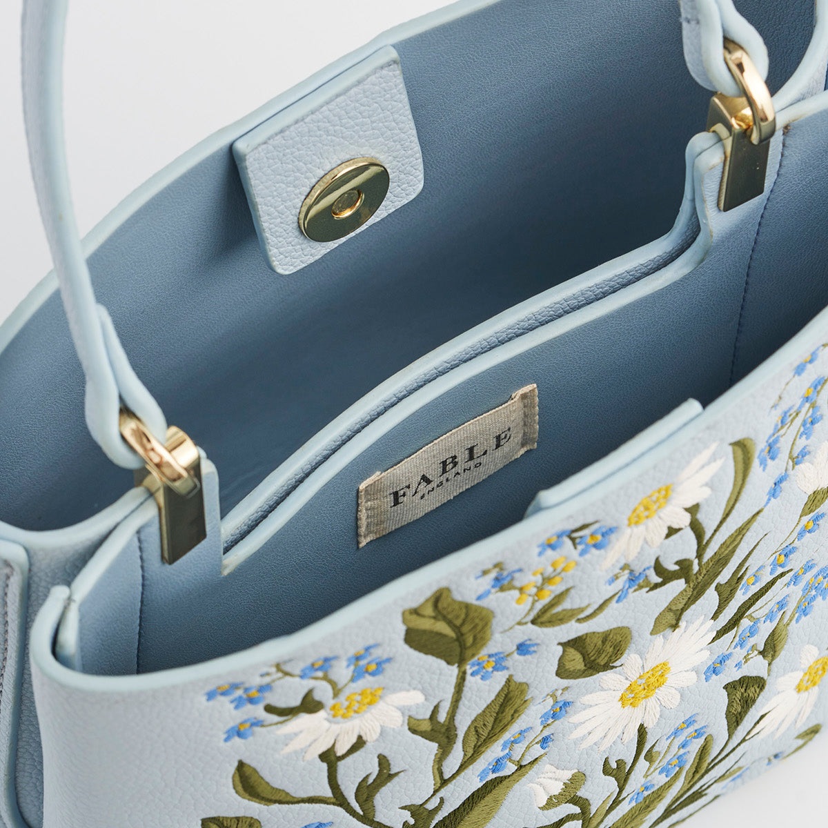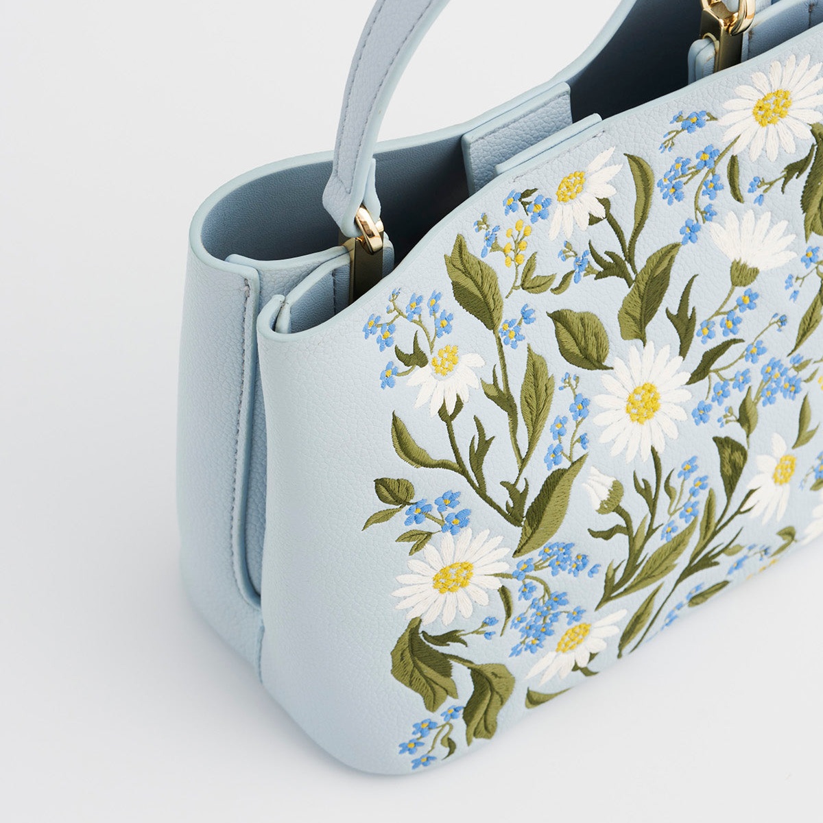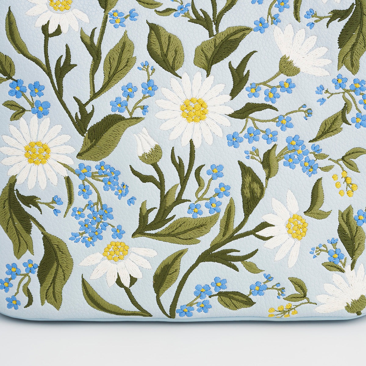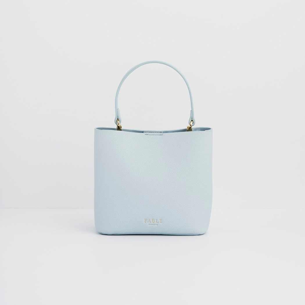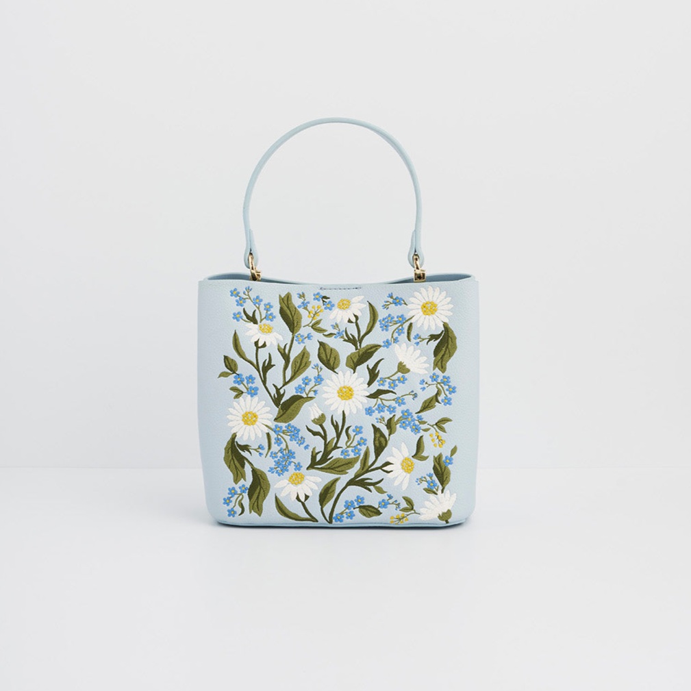 柔和淺藍顆粒紋皮革呈現清新質感,搭配勿忘我與雛菊刺繡,以白、黃、藍交織出細膩層次。水桶包輪廓小巧實用,配有立體提把與金色五金細節,收納日常隨身物品剛剛好,輕鬆展現優雅氣息。