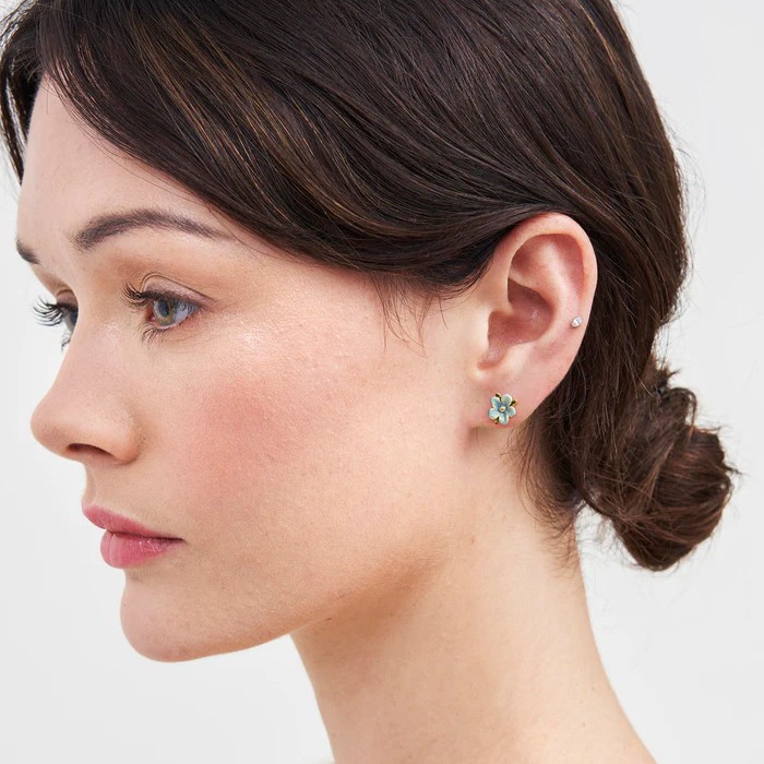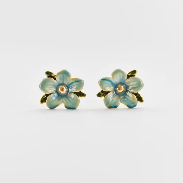 細緻手繪藍色琺瑯花朵展現溫柔層次,搭配 22ct 仿舊鍍金邊框,勾勒出清雅而耐看的輪廓。低調卻富有意涵,為日常造型增添一抹細膩光采,也適合作為象徵思念與祝福的溫柔心意。