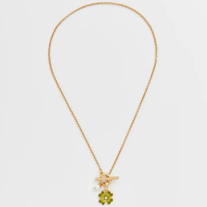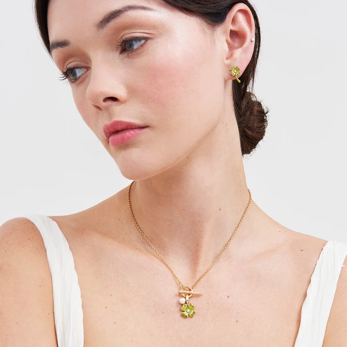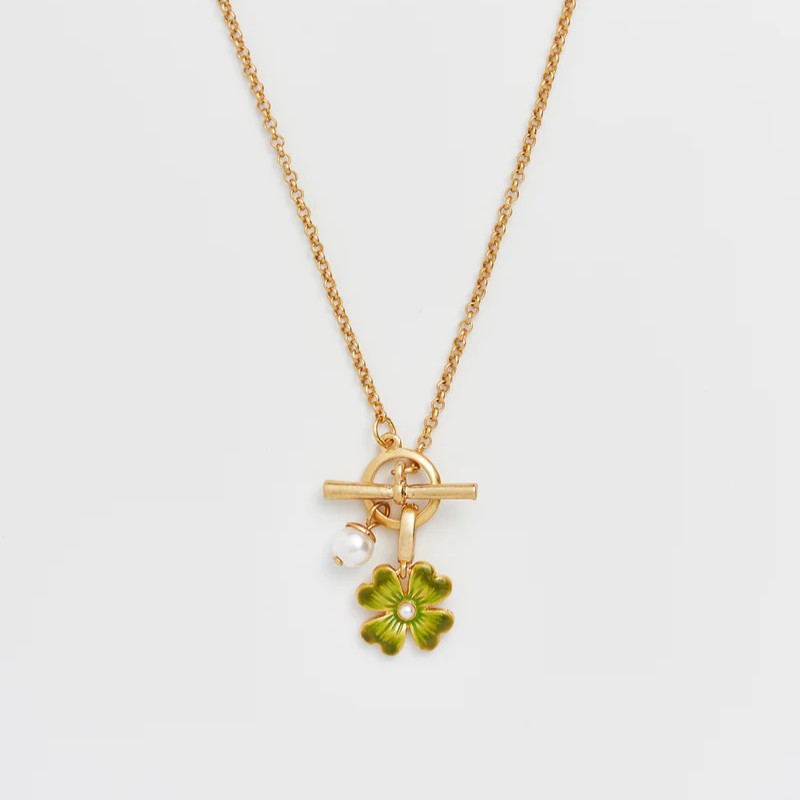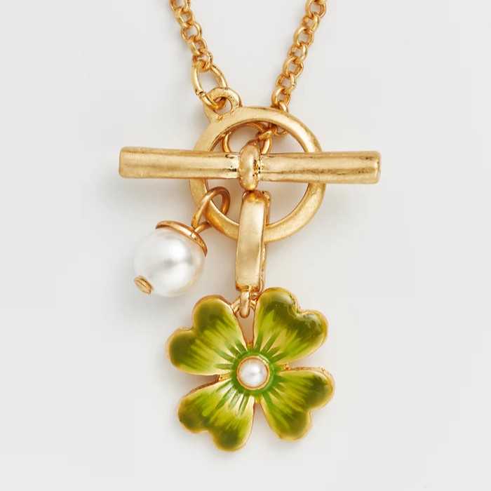 幸運草珍珠環扣項鍊以清新意象傳遞希望與喜悅。手工描繪綠色琺瑯四葉草,搭配柔潤仿珍珠點綴,在細節之中展現輕盈而優雅的層次。環扣設計帶來俐落觸感與平衡線條,於俏皮與經典之間取得恰到好處的從容氣質,無論單戴或疊搭,都能為造型添上一抹溫柔亮點。