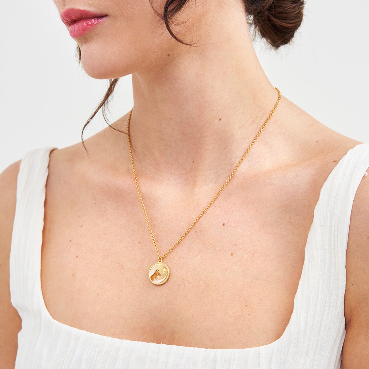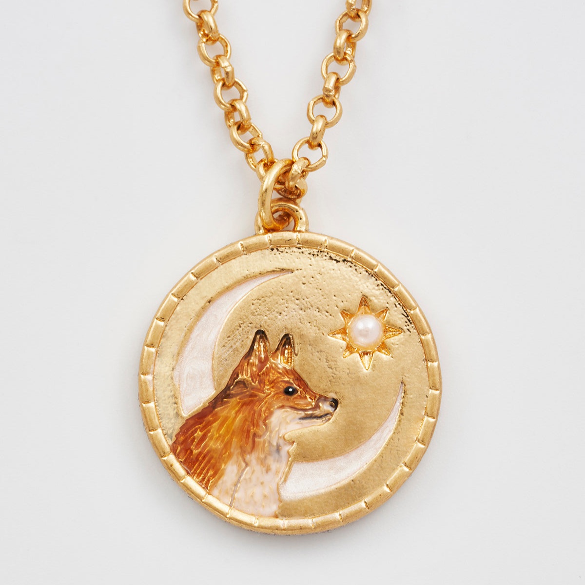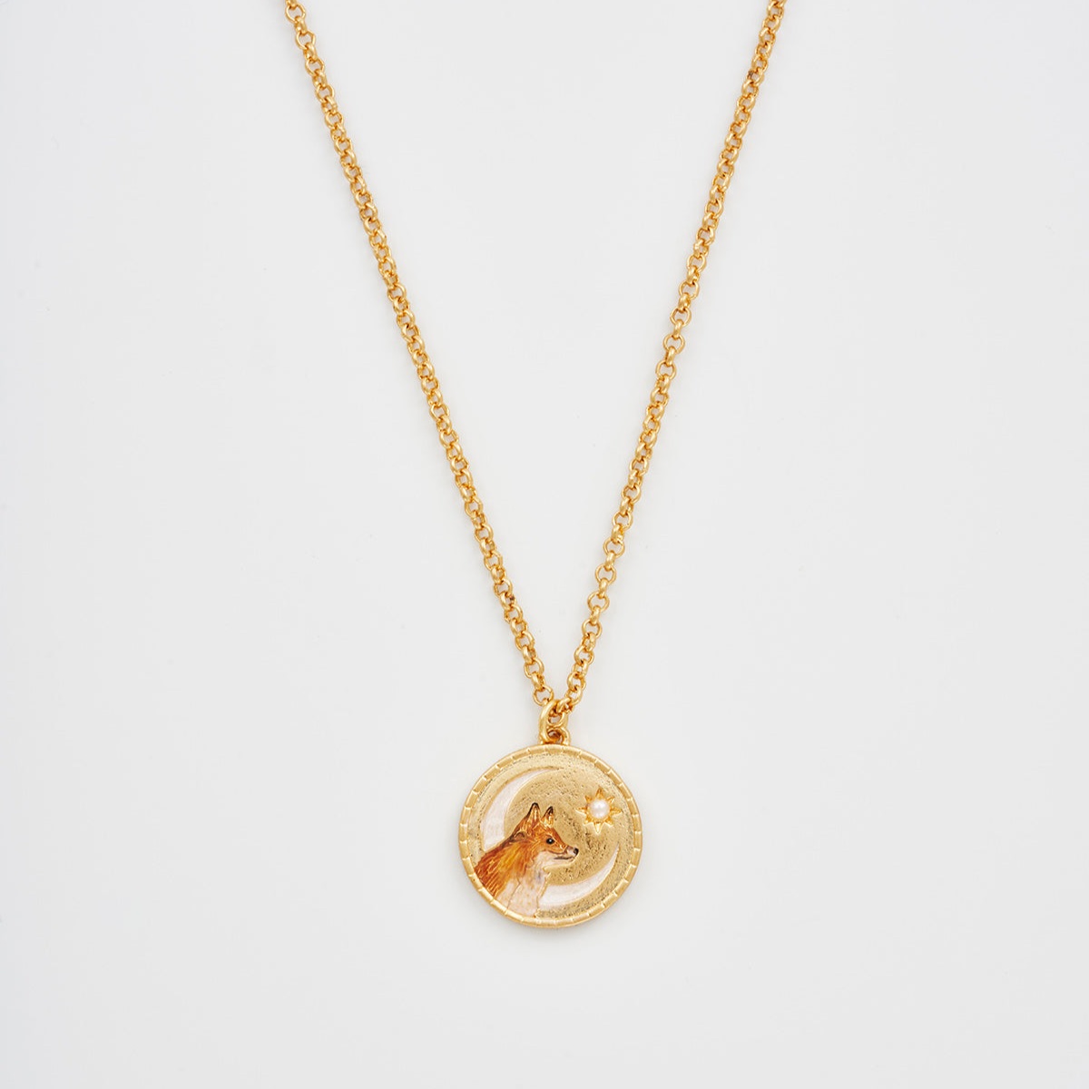 靈巧狐狸象徵智慧與堅韌,寓意在細節之中悄然展現。細緻琺瑯手工描繪狐狸輪廓,點綴柔和仿珍珠,優雅而富有層次。搭配 22ct 仿舊鍍金細鍊,側邊刻有 “Wisdom” 與 “Resilience” 字樣,低調傳遞內在力量與從容氣質,為日常造型添上一抹含蓄而堅定的象徵意義。